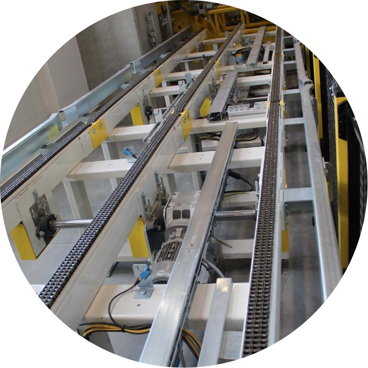 Приводные цепные конвейеры применяются для перемещения продукции по прямолинейным или криволинейным маршрутам в качестве альтернативы рольгангам. Движущиеся цепи переносят груз (обычно палеты) в различные зоны установки. Количество применяемых цепей и их размеры зависят от физических характеристик транспортируемого груза.