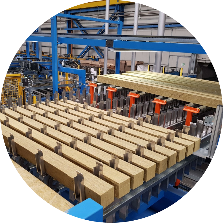 Все этапы процесса (охлаждение, кантование, формирование стопки, упаковка стопки и ввод вставок из полистирола) выполняются автоматически.
