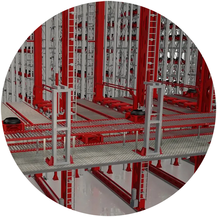 Автоматизированный склад Cassioli с подъемно-транспортными устройствами представляет собой полностью настраиваемую систему, которая позволяет размещать невулканизированные шины в соответствии с конкретными потребностями клиента с точки зрения доступного пространства, вместимости и потоков. Склад для невулканизированных шин с подъемно-транспортными устройствами является наиболее распространенным решением на новых участках и там, где нет проблем с пространством между существующим оборудованием. Чтобы удовлетворить различные требования к потоку и логике блокировки прессов, Cassioli разработала два типа подъемно-транспортных устройств: с одинарной и двойной колонной. Для каждого из них доступны разные конфигурации загрузки. Подъемно-транспортные устройства могут одновременно перемещать до четырех шин; однако каждый вилочный захват может быть независимым от других, чтобы при необходимости гарантировать максимальную гибкость одного лота. Внутри автоматизированного склада есть возможность хранения невулканизированных шин с контейнером/поддоном или без него: в первом случае подъемно-транспортное устройство будет осуществлять отбор с помощью стандартных телескопических вилочных захватов, а при отсутствии контейнера подъемно-транспортное устройство будет оснащено телескопическим поперечным вилочным захватом.