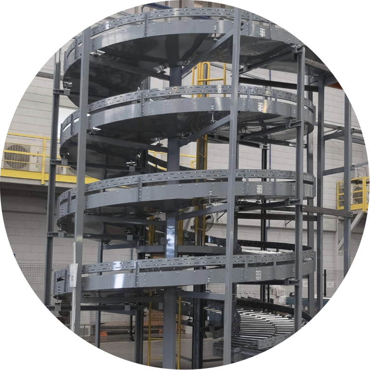 Спираль обеспечивает непрерывный поток простым и надежным способом, как и обычный ленточный конвейер. Конструкция спирального конвейера позволяет сэкономить место и легко перемещать шины или иные грузы с одного уровня на другой или создать накопитель в небольшом пространстве, используя перепад по уровню.